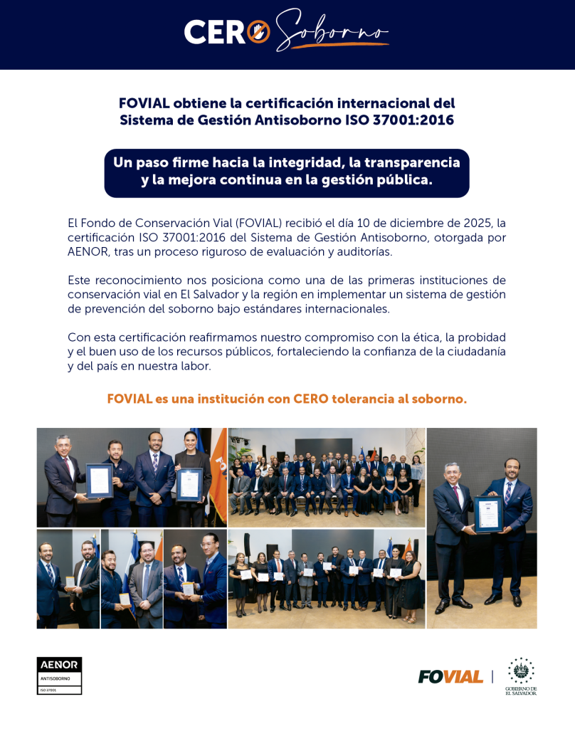 FOVIAL recibe certificaci贸n ISO 37001:2016 Antisoborno