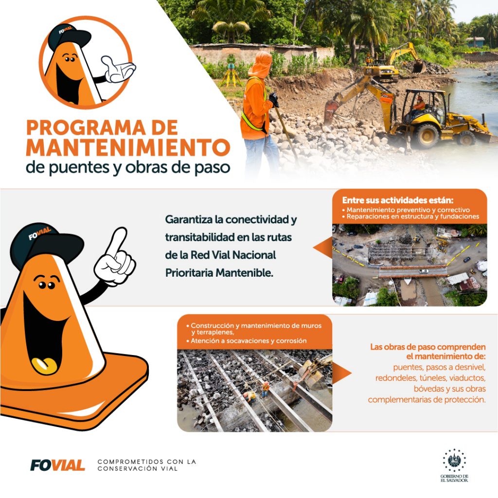 El mantenimiento de los puentes y obras de paso es el conjunto de actividades necesarias para garantizar la conectividad y transitabilidad en las rutas que corresponden a la Red Vial Nacional Prioritaria Mantenible. Los trabajos pueden ser en atenci贸n de la subestructura, superestructura, apoyos y estribos, plataforma de rodamiento o manejo de las aguas.